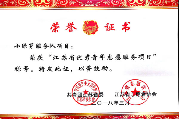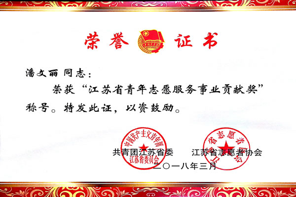 近日,团省委、江苏省志愿者协会下发了《关于表彰2017年度江苏省青年志愿者、志愿服务项目、志愿服务行动组织奖、志愿服务事业贡献奖的决定》,我校团委荣获“青年志愿服务行动组织奖”、纺织学院团委小绿芽服务队项目荣获“江苏省优秀青年志愿服务项目”称号、杨萍同志荣获“江苏省优秀青年志愿者”称号、潘文丽同志荣获“江苏省青年志愿服务事业贡献奖”称号。