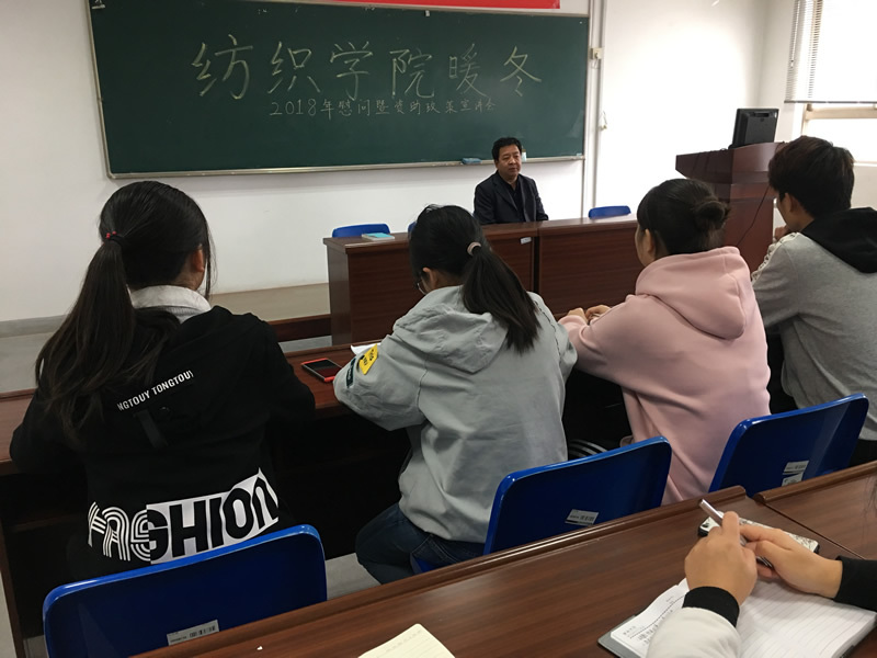 针对在校学生,纺织学院则开展了暖冬暨助学政策宣讲会,召集了全体在校生班级代表37名,通过国家奖学金、励志奖学金、助学金评定办法、奖学金评审办法等一系列政策的讲解,实实在在地帮助学生吃透政策,明确奋斗目标;党总支书记张锡春、副书记孙刘平、全体辅导员还与外省家庭经济困难新生直面对话,深入了解学生具体需求,开展帮困工作,体现人文关怀。