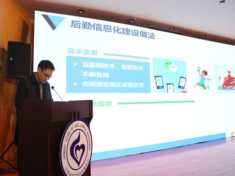 会上,田备做了省后勤协会信息化建设与管理专业委员会2018年度工作报告,总结了全省高校后勤系统信息化建设总体情况,阐述了高校后勤系统顺应教育后勤互联网从信息化到智慧化的发展新趋势。随后,南京大学、江南大学、江苏科技大学及我校分别作后勤信息化建设经验分享汇报,后勤总公司副总经理李圣峰以《融合互通、协同创新、精准服务》为题作了大会交流,详细介绍了后勤总公司信息化建设情况以及创新服务的举措。