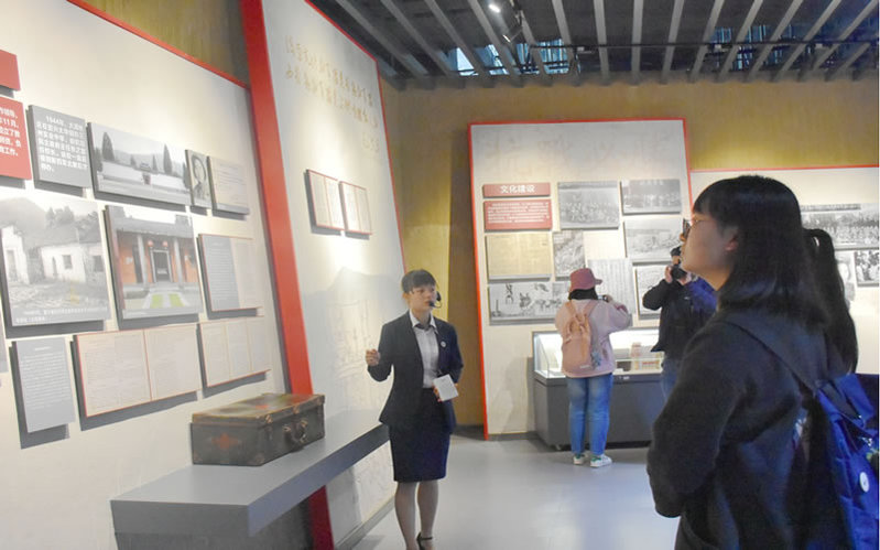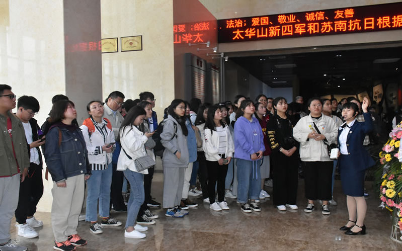 实践教学的首站是太华山新四军和苏南抗日根据地纪念馆。太华山有着 “苏南小延安”的美誉,是抗日战争后期苏浙皖边区的革命根据地,粟裕、叶飞、王必成等著名将领都曾在这里战斗过。整个纪念馆由序厅、尾厅以及六个部分的图版内容构成,通过图文介绍、实物展示、视频播放等形式,向同学们全方位地展现了苏南抗日斗争和新四军根据地建设的峥嵘往事,新四军“不拉夫、不派款、不扰民”的铁的纪律给同学们留下了深刻的印象。