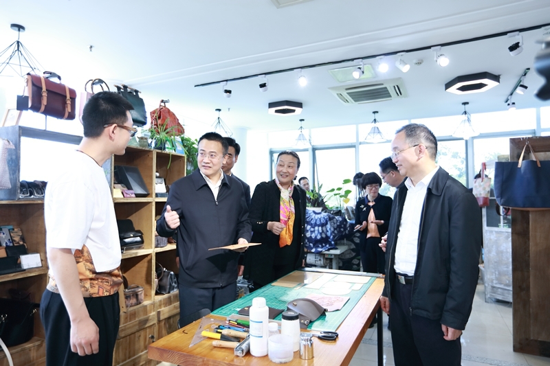 考察过程中,蔡长华与工作室的师生进行了亲切交谈。“这个作品是自己设计的吗?有相关课程吗?”在服饰品工作室,蔡长华如此问学生,在得到肯定的回答后,他表示很欣慰。在时尚礼品设计工作室,他称赞学生的乱针绣作品很漂亮,“将来都是大师级”。在纤维艺术工作室,了解到有的学生来自外省后,他关切地询问:“同学们在这边生活习惯吗?”在了解到皮具设计工作室指导老师创立了自己的手工皮具品牌、创业公司后,蔡长华给予了高度赞许,“你不光是老师,也是企业家。”