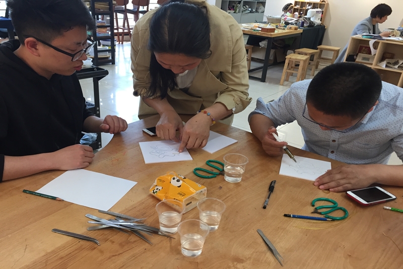 李爱红根据江苏康乃馨集团的交流学习要求,结合专业产品知识,安排大家先后参观了皮具设计工作室、时尚礼品设计工作室、面料陈列馆、服饰文化馆、陶艺大师工作室、乱针绣大师工作室等,分组体验了“掐丝”工艺、“皮具”工艺制作近3小时。