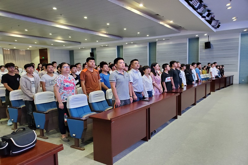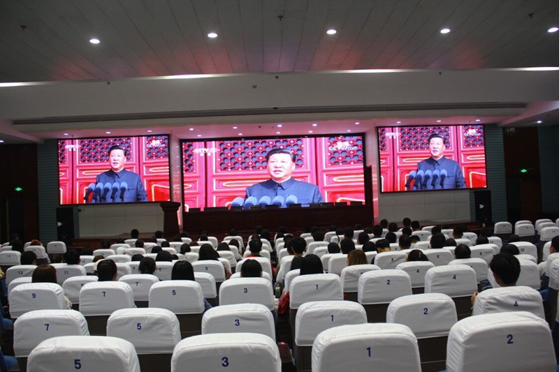 上午10点,当习近平总书记等党和国家领导人出现在天安门城楼时,伴随着礼炮轰鸣,会场上响起了阵阵热烈掌声。在场的所有师生全体起立,跟随直播高唱中华人民共和国国歌。