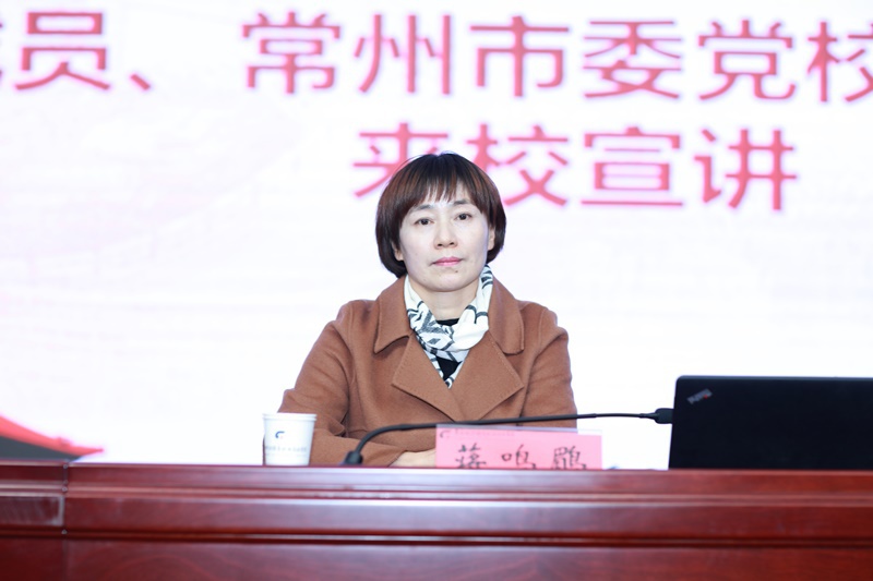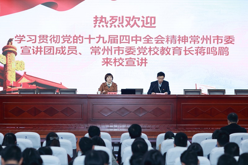 12月5日,在全校上下认真学习贯彻党的十九届四中全会精神的关键时期,我校邀请学习贯彻党的十九届四中全会常州市委宣讲团成员,市委党校校委委员、教育长蒋鸣鹛在图文报告厅作了题为《中国之治的政治宣言和行动纲领》的专题宣讲。我校全体领导班子成员、中层干部、师生代表参加学习。宣讲会由党委副书记、纪委书记王顺明主持。
