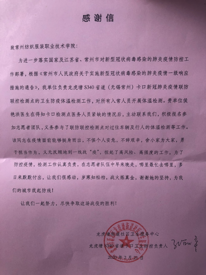 日前,学校收到来自龙虎塘街道社区卫生服务中心的感谢信。在信中,龙虎塘S340省道卡口卫生防控负责人孔亚峰代表社区对我校后勤处保健站站长侯艳洪同志义务参与联防联控监测点对来往车辆及行人的体温进行检测工作表示感谢。