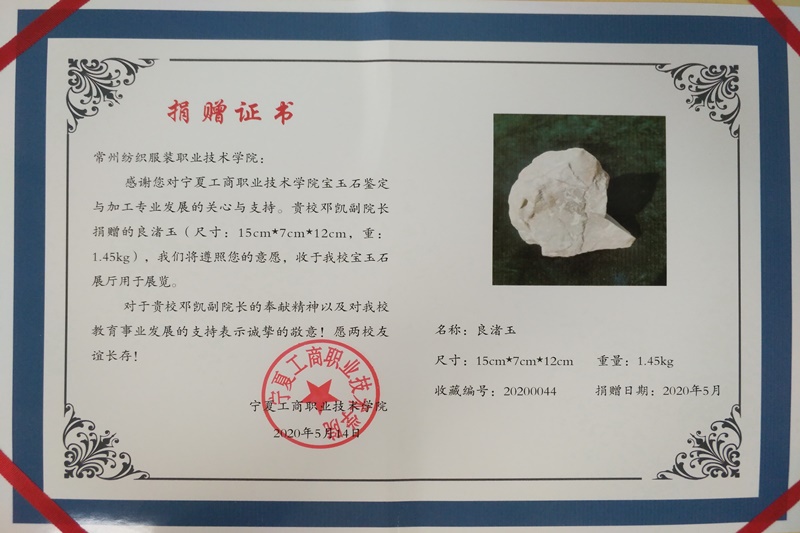 据悉,邓凯副院长向宁夏工商职业技术学院捐赠良渚玉原石一块,尺寸15CM×7CM×12CM,重1.45KG。宁夏工商职业技术学院宝玉石展厅收藏并用于参观展览。