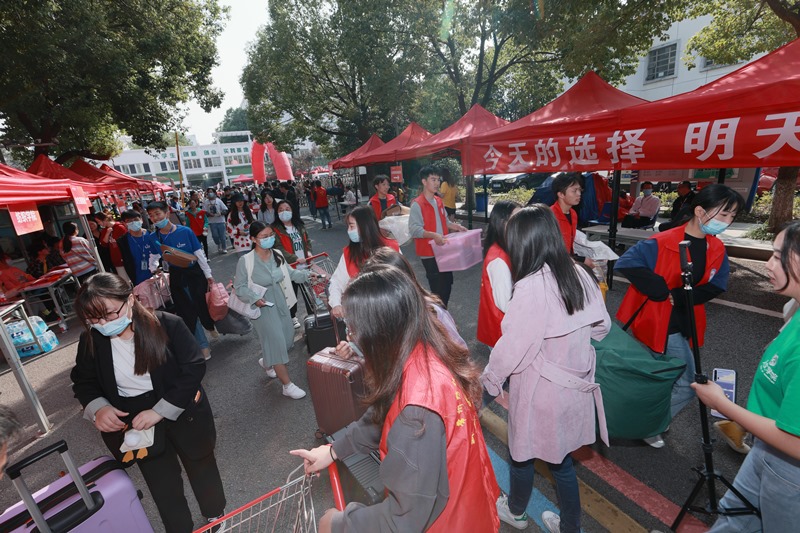 学校坚持“三全育人”的理念,多方联动,全员参与,用心服务。迎新报到当天,学校领导、老师、学生志愿者及各部门从早上6:30便以饱满的热情投入到迎新工作当中。接待现场设立了医疗服务站、绿色通道咨询点、家长休息区,专业咨询处等,专业负责人、教学名师等现场耐心、热情地为新生和家长服务、解答新生心中疑惑,让家长放心;后勤保障部设立服务点,提供复印、维修、咨询等服务;机关党总支组建了党员先锋示范岗,校领导、老师们积极报名,党员老师们冲锋在前,参与测温,把好第一道关。学校领导及相关部门负责人来到新生报到处,深入迎新现场与新生和工作人员亲切交谈,了解学生报到情况及新生入校后的生活情况,送上最真挚的问候与关怀。因为疫情防控的需要,今年的新生家长均不进入校园内送自己的孩子,为了让家长们安心,校团委组织校、院两级团委设立团员先锋岗,组织志愿者们搬运行李、一对一引导新生入校,竭诚为迎新工作贡献青春力量。新生们能够时刻感受到常纺师生的热情,体会到学校的人文关怀。