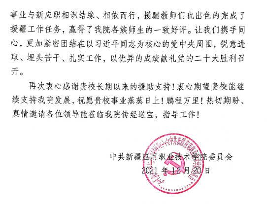 近日学校收到来自新疆应用职业技术学院党委的一封题为《心系新应职 情牵两地缘》的感谢信。感谢我校纺织学院王建平老师两赴新疆,支援新疆应用职业技术学院建设。