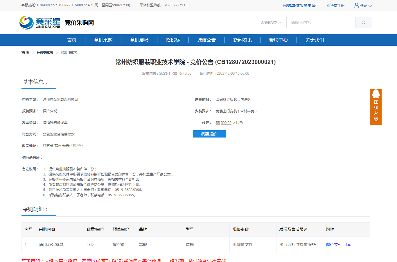 【采购公告】通用办公家具采购项目询价公告