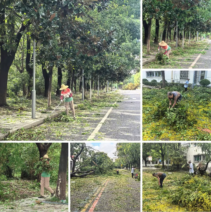 台风过后,校园出现多处树木倒伏、积水、散落树枝与杂物等紧急情况。为全面了解校园受损情况并及时开展后续修缮工作,校领导第一时间现场巡察,紧急调度。正值中秋佳节团圆之际,后勤保障部工作人员没有丝毫犹豫,吹哨报到,加班加点。后勤保障部直属党支部组织党员先锋队冲在一线,即刻清理路障,冲洗主干道路面,确保师生安全通行;工程人员全体出动,抢修设备,排查洗澡热水系统,检修空调,排查餐厅设施设备情况,确保学校师生的基本生活设施正常运行。同时,部门自上而下多次对教学楼、公寓、餐厅、重点设施设备等进行全面的隐患排查,为学校正常运行做好充分的准备,用实际行动诠释了“后勤不后,服务先行”的承诺。