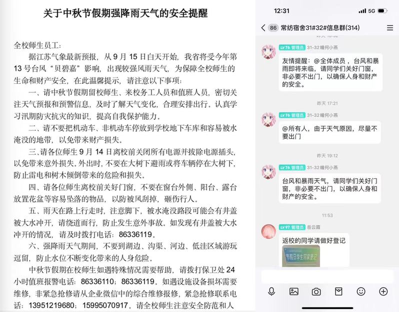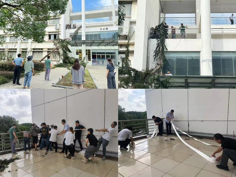 台风逼近之际,后勤保障部按学校党政要求积极部署,制订防汛应急预案,向全校各单位、教职工发布预警,强调关紧门窗,注意安全,全力以赴保障在校师生生命财产安全。校园范围内实施责任包干制,落实到人,对校园重点部位进行拉网式巡查,检查每栋楼屋顶,做好防雷测试,排查所有设备设施,在相关责任区域(高配房、1#楼、7#楼、8#楼)放置防汛材料,布置挡水板,检查地下室排水设备运转情况,安排抢险值班表。实施防台日报制及动态巡查制,充分利用新媒体平台、工作群等渠道,针对台风天气情况,校园建筑物、绿化等受损情况,河道水位变化情况,动态监控和报送,及时掌握台风进展情况。