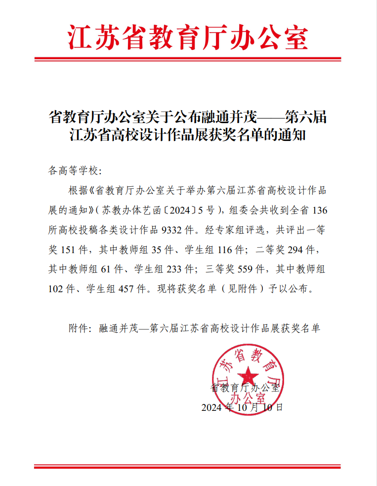 近日,江苏省教育厅主办的“融通并茂——第六届江苏省高校设计作品展”获奖名单揭晓。创意设计学院师生参赛作品得到评委高度肯定,荣获教师组一等奖1项,学生组一等奖1项、二等奖2项、三等奖5项。