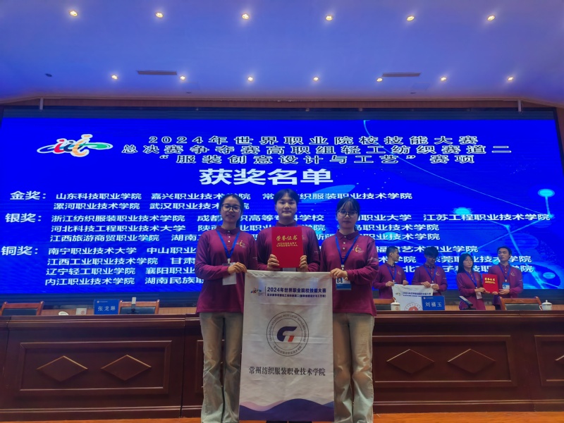 10月23-25日,2024年世界职业院校技能大赛总决赛争夺赛高职组轻工纺织赛道(二)服装创意设计与工艺赛项在山东科技职业学院开赛。本次大赛主题为“技炫青春,能创未来”。来自全国25个省(直辖市)共50支队伍参赛。我校雍定圆(服设213A班)、何若然(服工213B班)、巫一丹(服设233H班)(指导老师:穆雪梅、徐君)不畏强手、奋勇拼搏,斩获金奖!