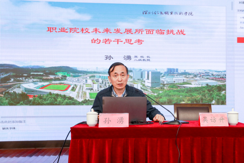 10月25日上午,深圳信息职业技术学院原校长,现任广东省政协委员、深圳市政协常委、市政协科教卫体专委会专职副主任、机关二级巡视员孙湧教授应邀为全校教职工作题为《职业院校未来发展面临挑战的若干思考》的主题报告。报告会由党委书记吴访升主持。