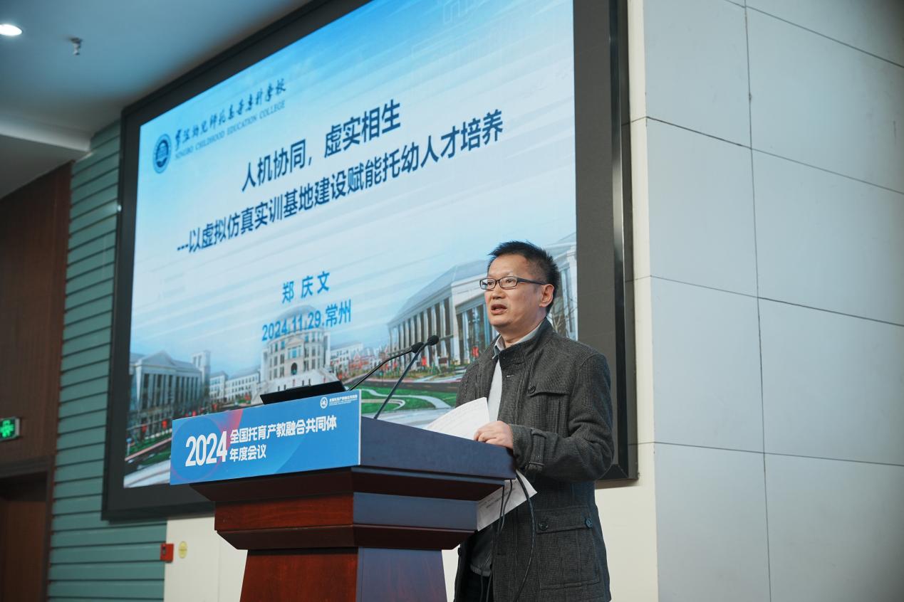 宁波幼儿师范高等专科学校儿童研究院院长郑庆文作了题为《人机协同,虚实相生--以虚拟仿真实训基地建设赋能托幼人才培养》的报告,从虚拟仿真建设、应用及成效进行了经验分享。