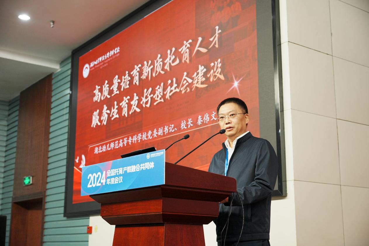 湖北幼儿师范高等专科学校校长秦伟文分享了题为《高质量培育新质托育人才 服务生育友好型社会建设》的报告,展示了学校在现代职业教育体系建设和深化人才培养体系改革方面取得的积极成效。