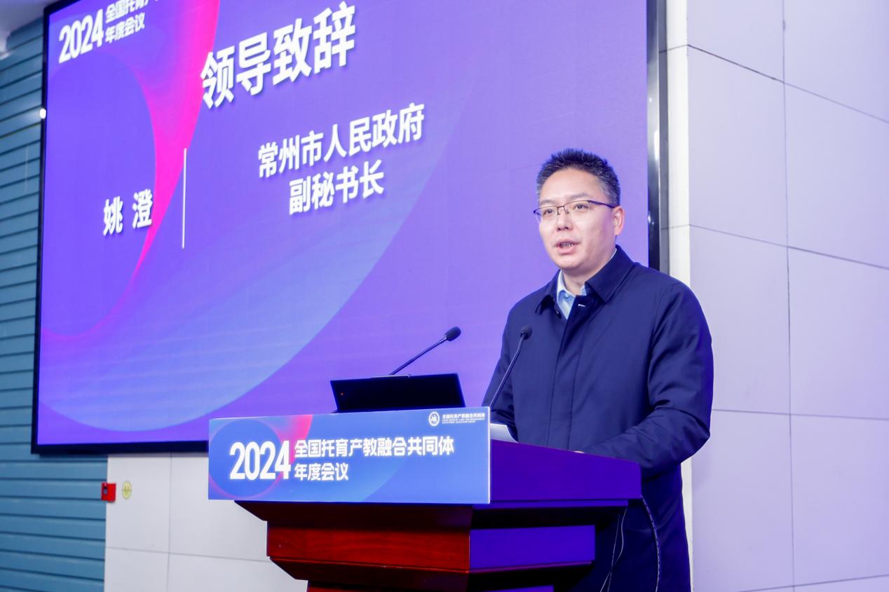 常州市人民政府副秘书长姚澄在致辞中强调了托育产教融合对于提升国民健康水平和推动社会发展的重要性,并表达了对共同体未来发展的期待。