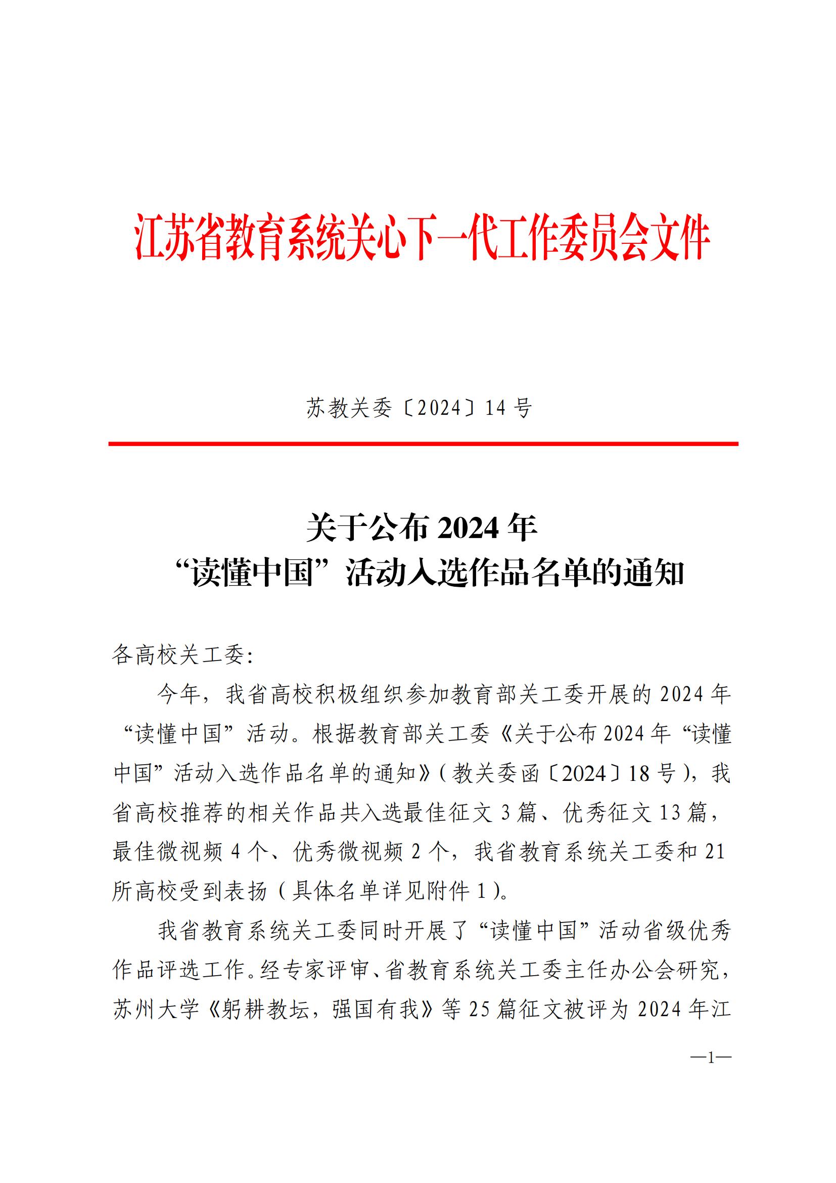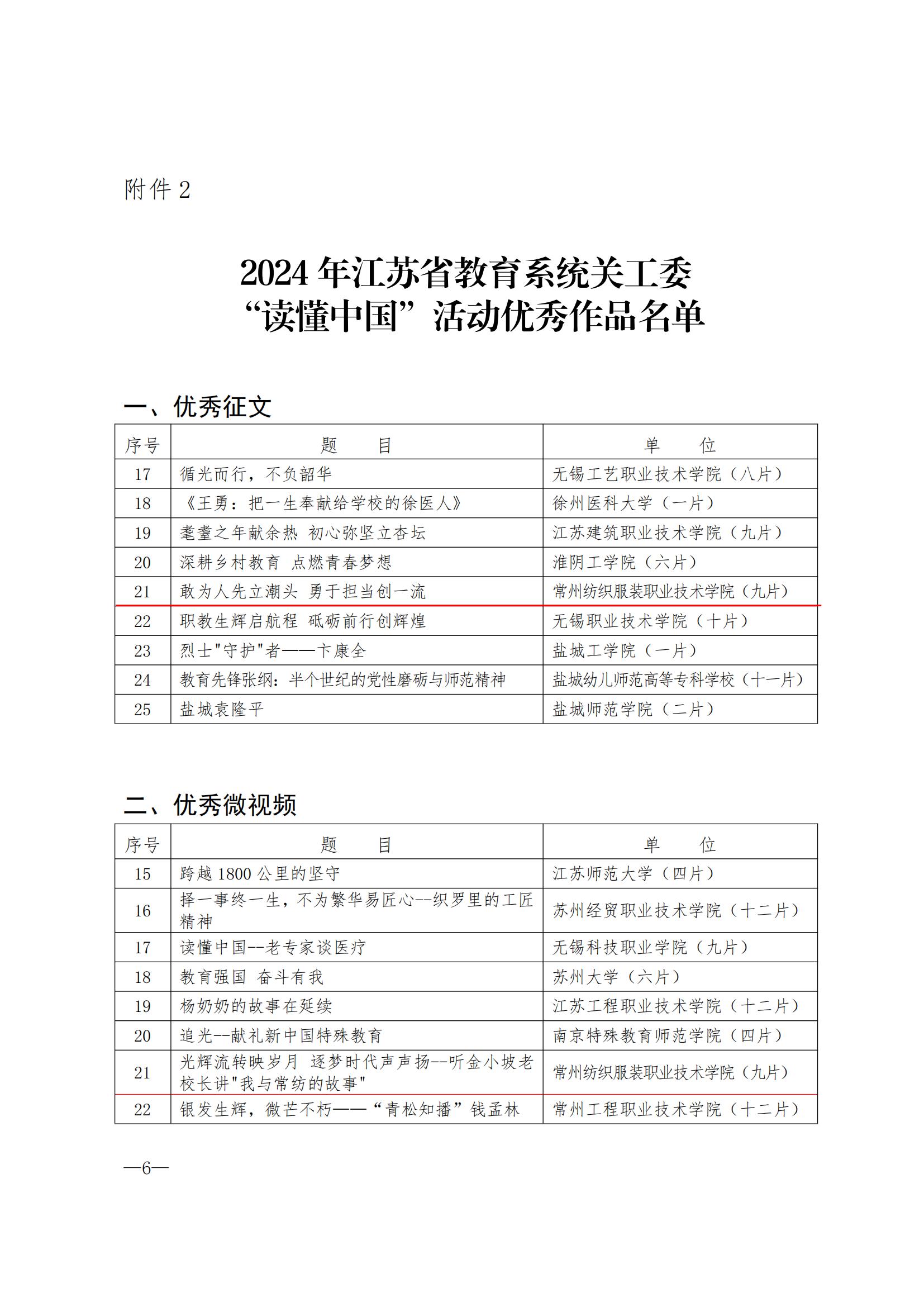 近日,江苏省教育系统关工委下发了《关于公布2024年“读懂中国”活动入选作品名单的通知》苏教关委〔2024〕14号,我校选送的服装学院关工委制作的微视频《光辉流转映岁月 逐梦时代声声扬--听金小坡老校长讲“我与常纺的故事”》获得微视频优秀奖(共25个),征文《敢为人先立潮头 勇于担当创一流》获得征文优秀奖(共22个)。