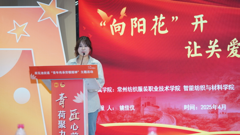 4月27日下午,智能纺织与材料学院与荷花池街道共同开展了 “青荷聚力 匠心前行—青年传承劳模精神”主题活动。钟楼区委副书记、荷花池街道党工委书记邹源,区委副书记、副区长蒋锐,副区长胡金芳,总工会党组书记、主席李文军,共青团钟楼区委书记金杰,智能纺织与材料学院副书记史京军及“六边形”辅导员工作室、菁·纬班主任工作室、向阳花志愿服务队、织韵染艺社团,常州市劳模工匠代表等50余人参加了活动。