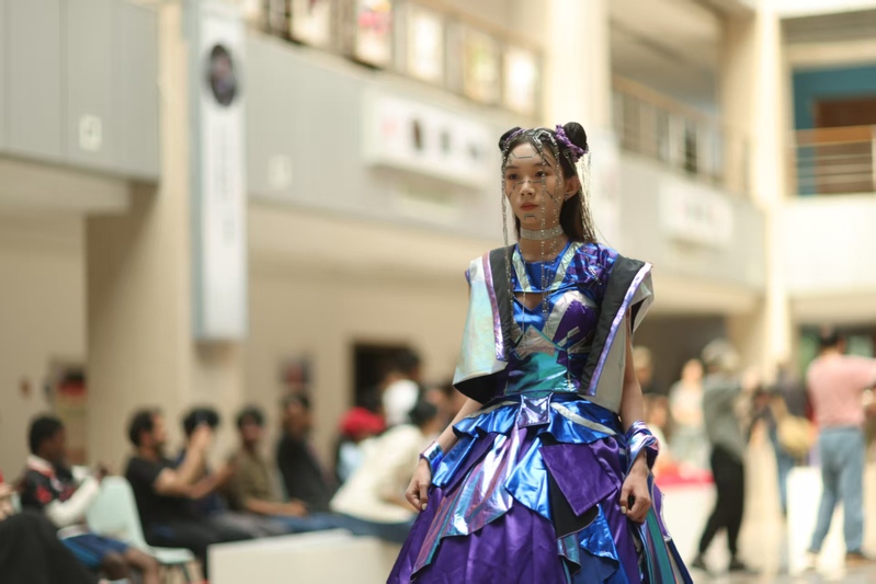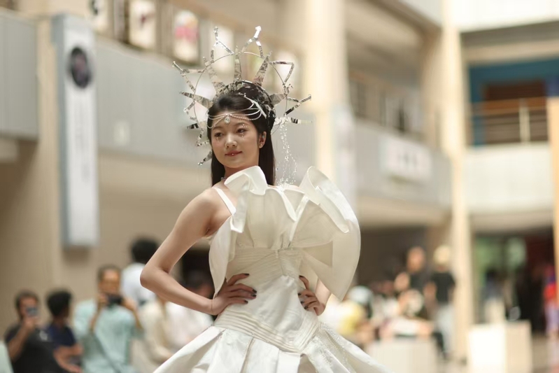 发布会现场,一件件精心设计的作品依次亮相,瞬间吸引了在场所有人的目光。这些作品通过发型设计、妆容搭配、饰品设计及服装造型等多维度的巧妙融合,展现出新时代年轻人独特的视角与创意。从中国传统纹样中提取的古朴韵味,从少数民族艺术元素里汲取的灵动色彩,再到几何图形造型带来的现代感,设计者们大胆运用廓形、材质、工艺、色彩,对传统与现代进行全新的解读,为观众带来了一场前所未有的视觉享受。每一组作品都凝聚着师生们的智慧与汗水,彰显着他们对专业的执着追求与无限热爱,现场不时响起阵阵掌声与赞叹声。