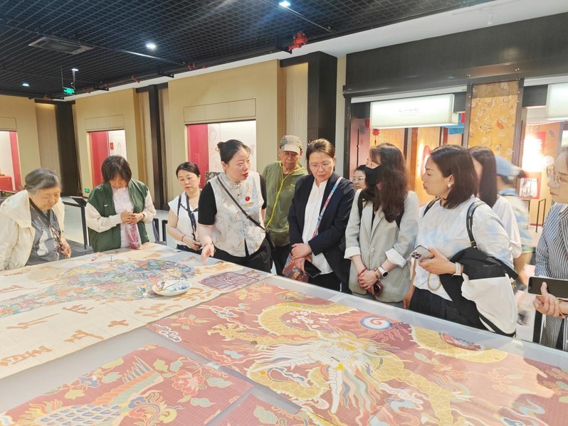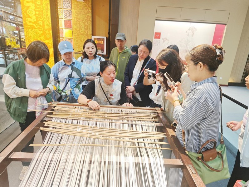 云锦因其“寸锦寸金”的珍贵特性,被誉为“中华一绝”,其织造过程需要两位工匠配合操作大花楼木织机,历经“挑花结本”“通经断纬”等百余道工序方能完成。党员同志们驻足观看云锦织造演示,惊叹于传统工匠的智慧与耐心,纷纷感慨:“云锦的每一针每一线都凝聚着匠人的心血,这种精益求精、追求卓越的精神,正是我们设计工作者需要学习和传承的。”
