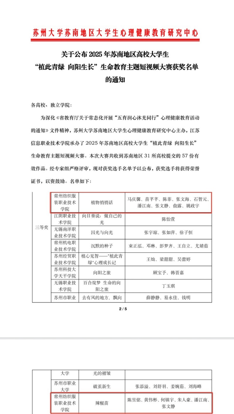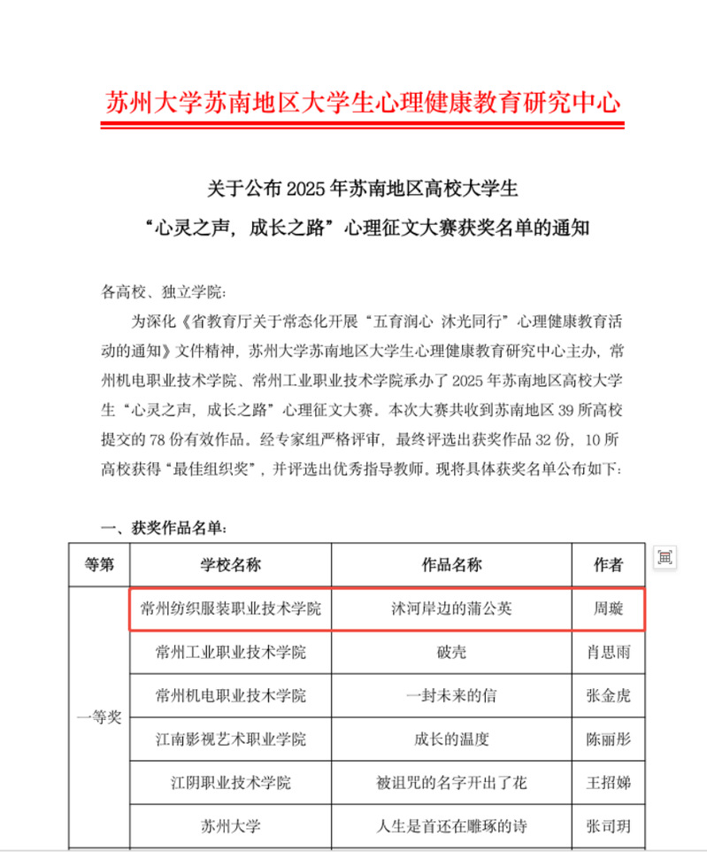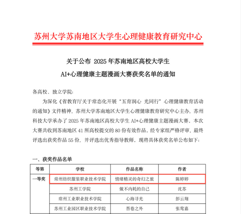 近日,我校多项心理健康教育活动作品在苏南地区高校大学生心理健康活动中获奖。人文学院辅导员朱梅玲指导的作品《沭河岸边的蒲公英》在苏南地区高校大学生“心灵之声,成长之路”心理征文大赛中荣获一等奖;纺织学院辅导员陈玳指导的作品《情绪精灵的奇幻之旅》在AI+心理健康主题漫画大赛中荣获一等奖;数商学院辅导员田嘉乐指导的《植物悄悄话》、《辣椒苗》在“植此青绿向阳生长”生命教育主题短视频大赛中荣获三等奖。