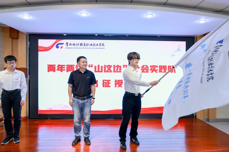 朱鹏为我校两年两访“山这边”社会实践队出征授旗,暑期实践队的同学们即将踏上洑家村的土地,探寻该村 30 年来实现蝶变的秘钥。