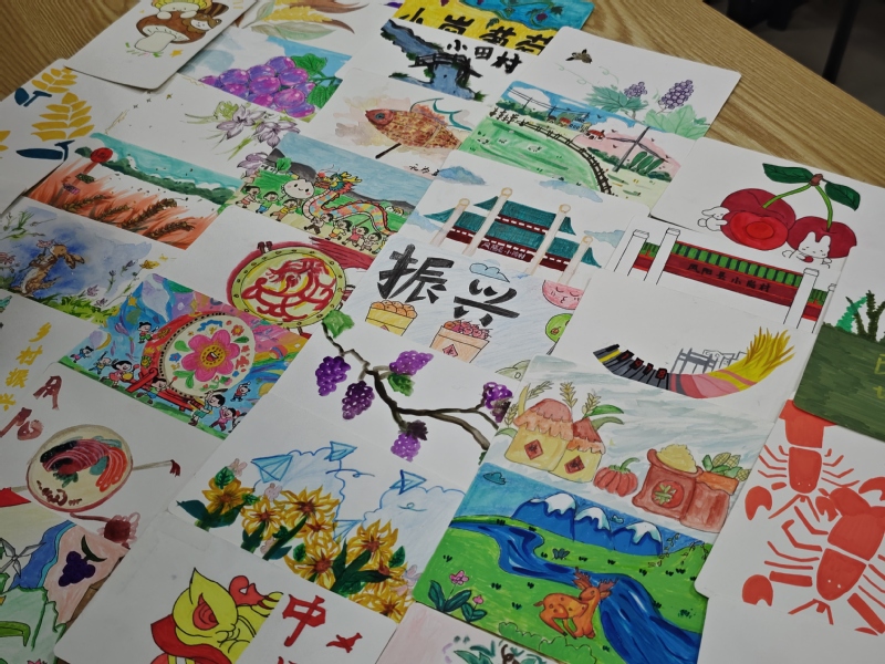 深入探寻小岗红色文化精髓后,团队中的十几名纺设专业成员凝心聚力,设计出团扇、明信片等多种类型文创产品。在空白团扇上,成员们以细腻笔触勾勒框架,精心搭配和谐色彩,细致填涂每一处线条,村容村貌、非遗花鼓、特产葡萄、非遗凤画等丰富元素在扇面上栩栩如生、跃然而出。小小明信片亦承载着深情厚意,队员们一笔一画勾勒出对小岗村的热爱与敬意,使其成为跨越空间、传递情感的温馨桥梁,让收到明信片的人感受小岗村独特的文化魅力。