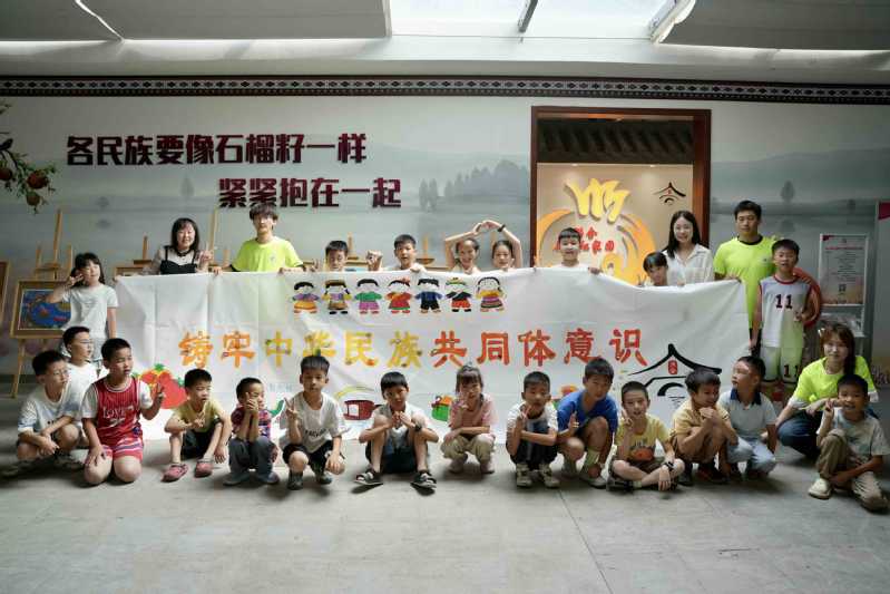 在方里村,团队通过手绘木制特色服饰挂件,在动手实践中感受中华文化的多样性与包容性。在洪合镇,与小朋友们共绘长达五米的“铸牢中华民族共同体意识”主题画卷——“红船”象征初心使命、“石榴”寓意民族团结、“粽子”承载地域文化、“恐龙”启迪探索精神、手牵手的民族人物形象,更传递了“中华民族一家亲”的情感纽带。团队成员还带领小朋友们走进非遗文化的世界,亲手制作非遗宋锦珍珠团扇。