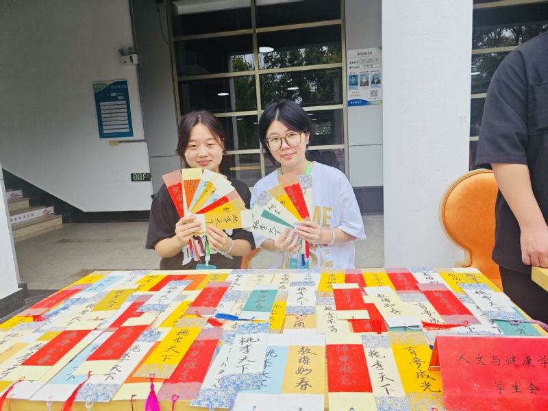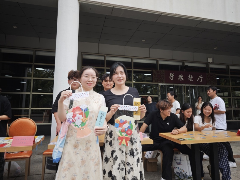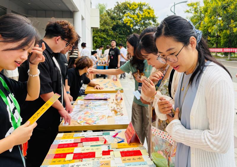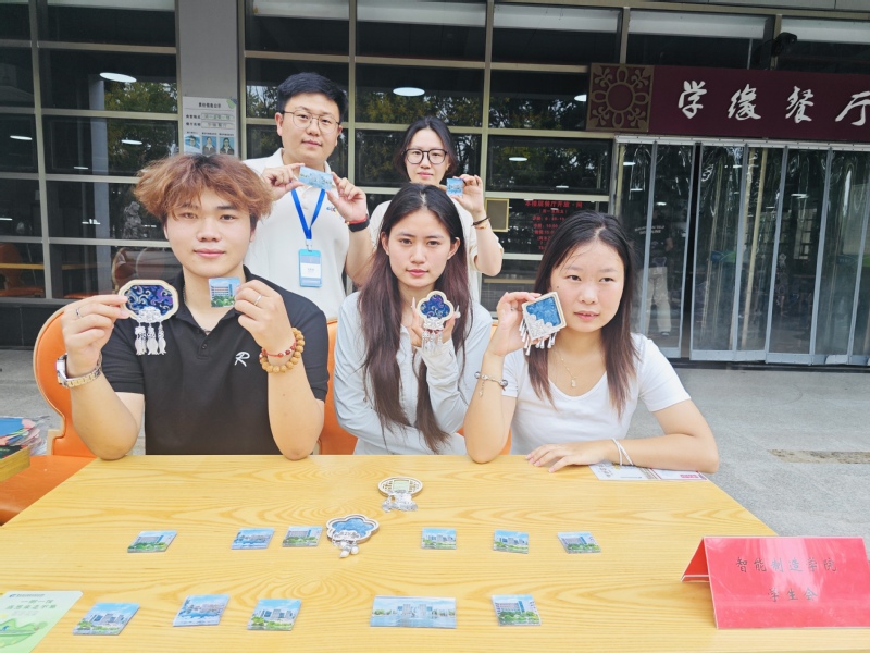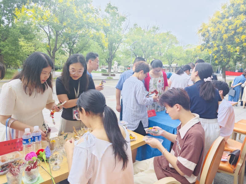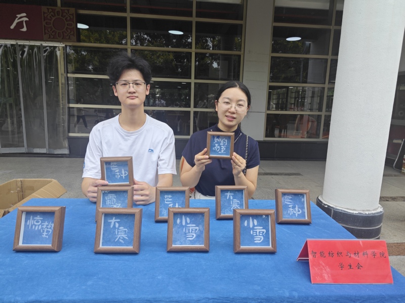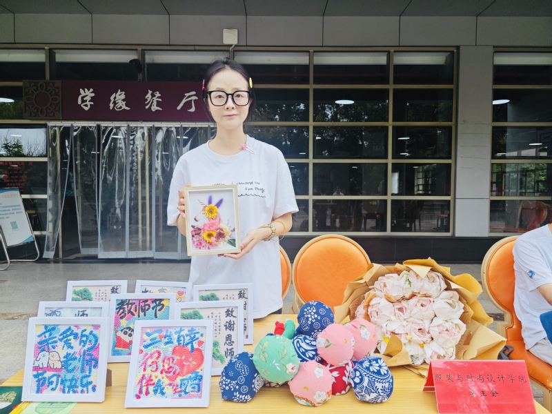 校团委、校学生会以“师情永驻·暖心相伴”为理念,定制了印有“教师节快乐”“老师您辛苦了”“师恩难忘”等字样的冰箱贴,以简洁温馨的设计传递祝福,感谢老师们无私的奉献和辛劳。创意设计学院团委、学生会提前准备了100份水晶香薰,并在活动现场设有私人定制区,让老师根据喜好定制,收获专属感动。当一份份礼物传递到老师手中,那抹芬芳也好似在诉说着感恩。智能纺织与材料学院团委、学生会联合织韵染艺社,推出“非遗扎染寄师恩”活动,裁布、扎花、豆染、固色、装框,用心用情打造独版蓝白相框,将非遗技艺与感恩教育深度融合,让传统文化在校园中焕发新生。服装与时尚设计学院团委、学生会策划了“师恩如歌,岁月情长”活动,以艾草锤传递健康关怀,用钻石画闪耀师恩光芒,借干花框定格暖心情谊。这些礼物虽不昂贵,却蕴含着对老师最诚挚的敬意与感恩。智能制造学院团委、学生会设计了双主题冰箱贴,“校园记忆·风景印记”系列选取学校标志性场景进行文创校韵传承,“非遗瑰宝·文化传承”系列借鉴苗族银饰纹样融合工艺之美,来表达对老师们的感谢之情、祝福之意。数字商贸学院团委、学生会给老师们赠送了螺钿饰品和花束贺卡,以这份独具意义的礼物,给老师们留下一个深刻而温暖的节日记忆。螺钿所蕴含的匠心精神,恰如老师们在日常教学中以悉心培育桃李的执着与专注。人文与健康学院团委、学生会的“书签传情,敬颂师恩”活动,制作了300份蜡染书签,手写暖心祝福,饱含着学生的心意,承载着对师者的感恩之情,搭建起师生间情感沟通的桥梁,让敬意与温暖在校园中传递。